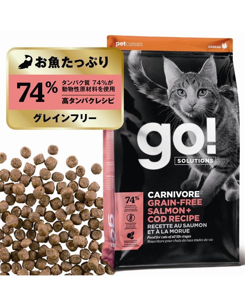 GO! カーニボア サーモンキャットは、「カーニボア=肉食」のシリーズ名が表すとおり、贅沢に動物性原材料を配合したとびきり美味しいグレインフリーのプレミアムキャットフードです。