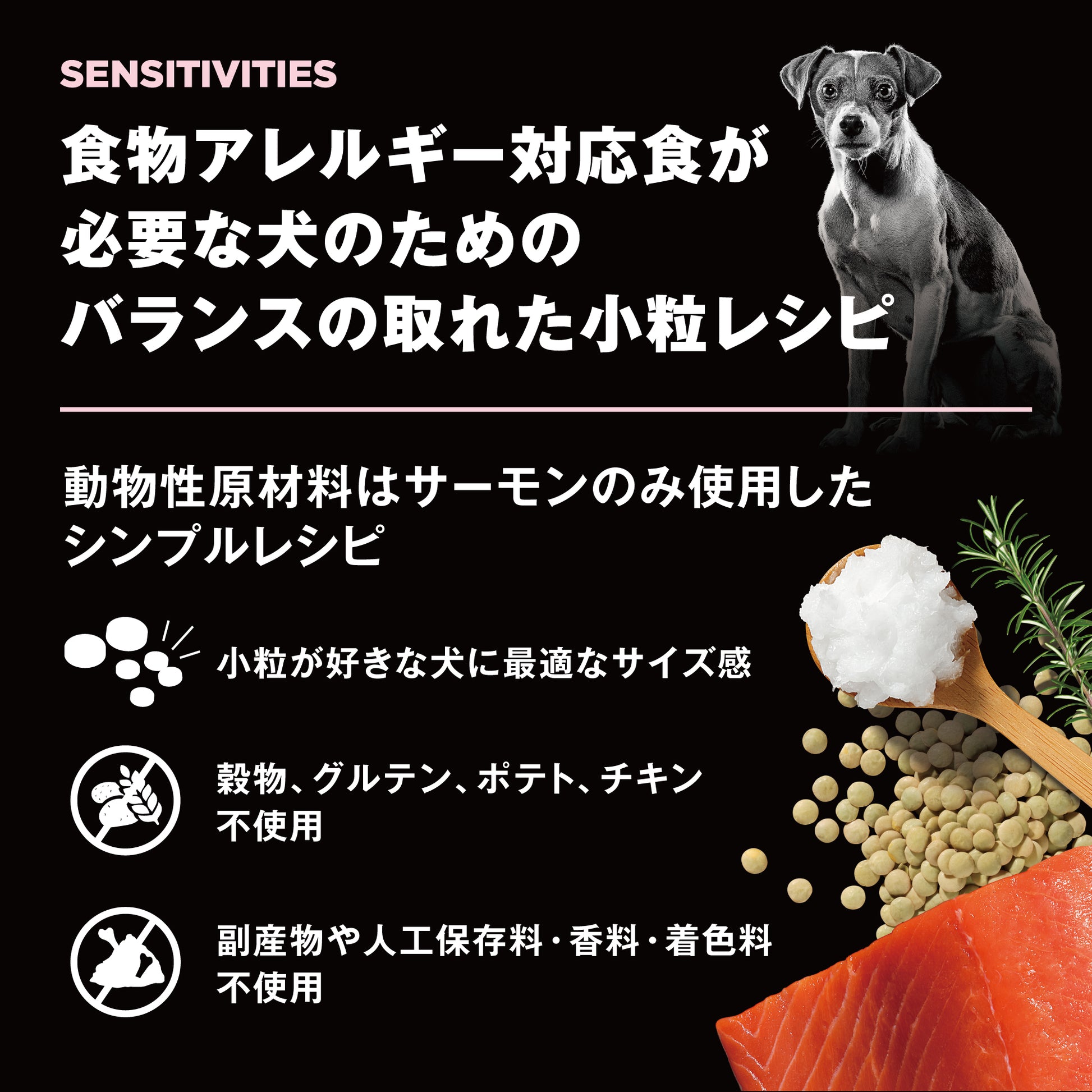アレルギーの悩みがない全ての犬たちにとっても、食材の味わいを最大限に生かした美味しい総合栄養食となり、フードローテーションにもおすすめです。